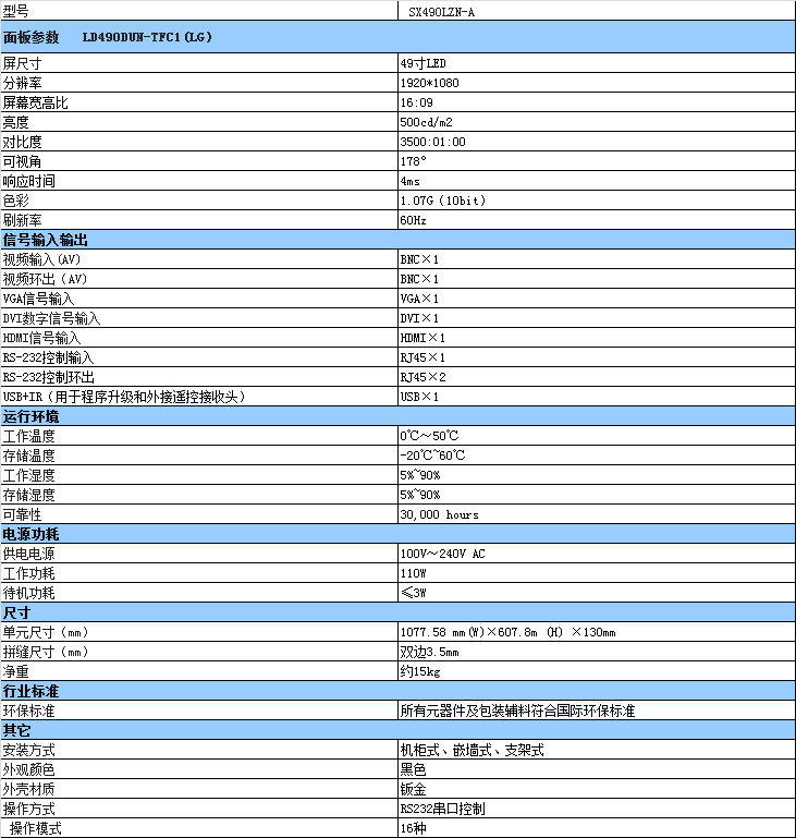 49寸3.5mm拼接屏選用的是LG的IPS液晶面板,1920*1080分辨率,1300:1比照度,450亮度, 外形尺寸1077.58mm×607.8mm如下圖所示: