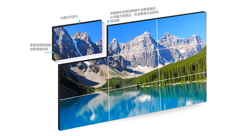 液晶屏正面沒有拼縫,以及沒有黑框線條,兩屏之間共用一整條邊縫補償屏跨接顯示,左邊縫補償屏覆蓋右黑框;上邊縫補償屏覆蓋下黑框。完全覆蓋屏與屏之間的安裝物理間隙;采用小點距邊縫補償顯示技術與液晶顯示單元的完美結合,使畫面整體性近似小間距LED產品,畫質、分辨率、成本、色彩還原、維護等方面大大優于小間距LED產品。